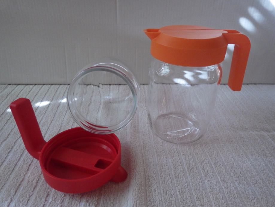 Dve stekleni dozi primerni za shranjevanje ali kot vrček, prostornina 1 l, višina 17 cm, rdeč in oranžen pokrov.