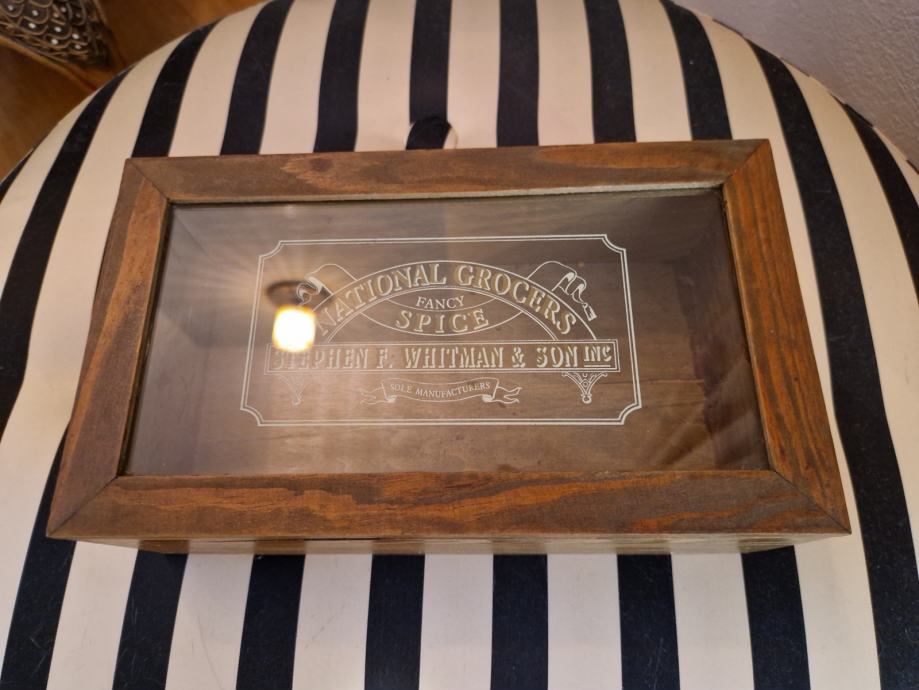 Prodam čudovito leseno škatlo za shranjevanje z retro šarmom in steklenim pokrovom z napisom: