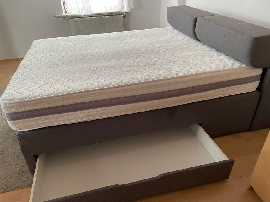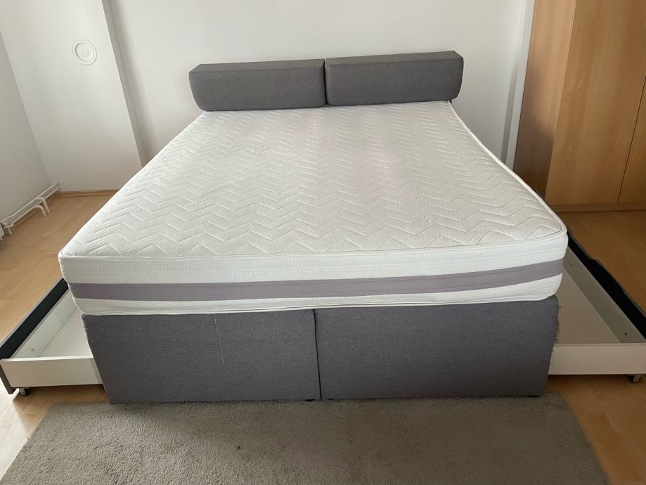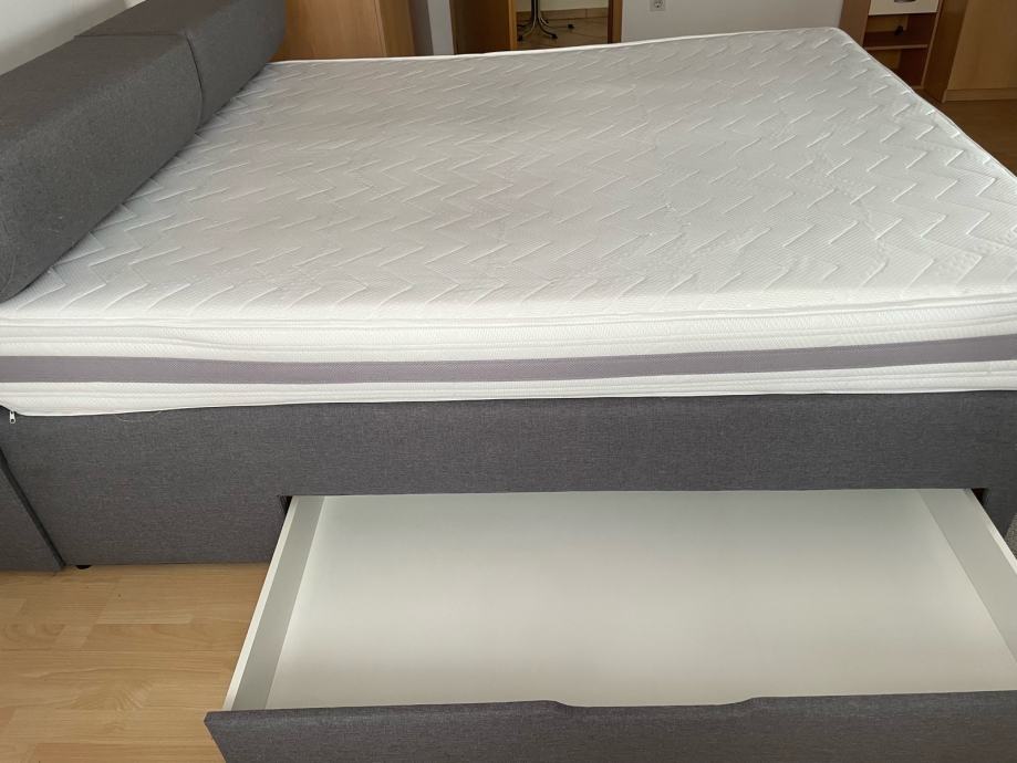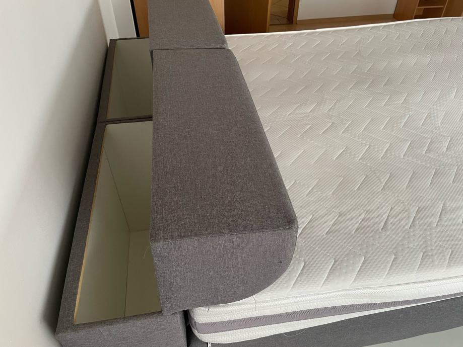 Prodaja se rabljena postelja boxspring dimenzij 160x200, z predali na vsaki strani postelje in predali v zglavnem delu.