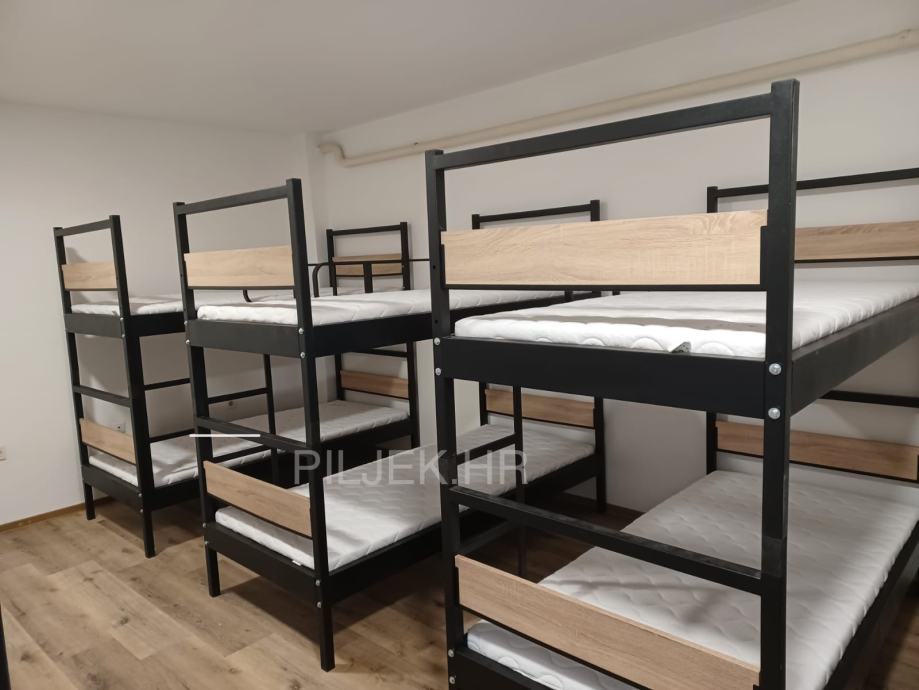 Kovinska postelja robustne konstrukcije za opremo spalnih prostorov v bivalnih kontejnerjih, šotorih, dvoranah ali samskih domovih.