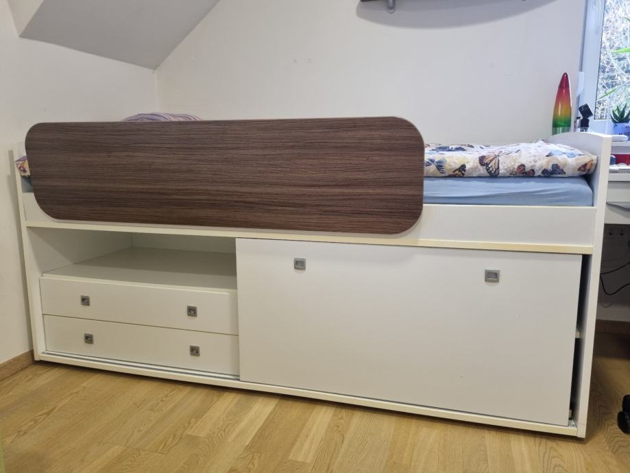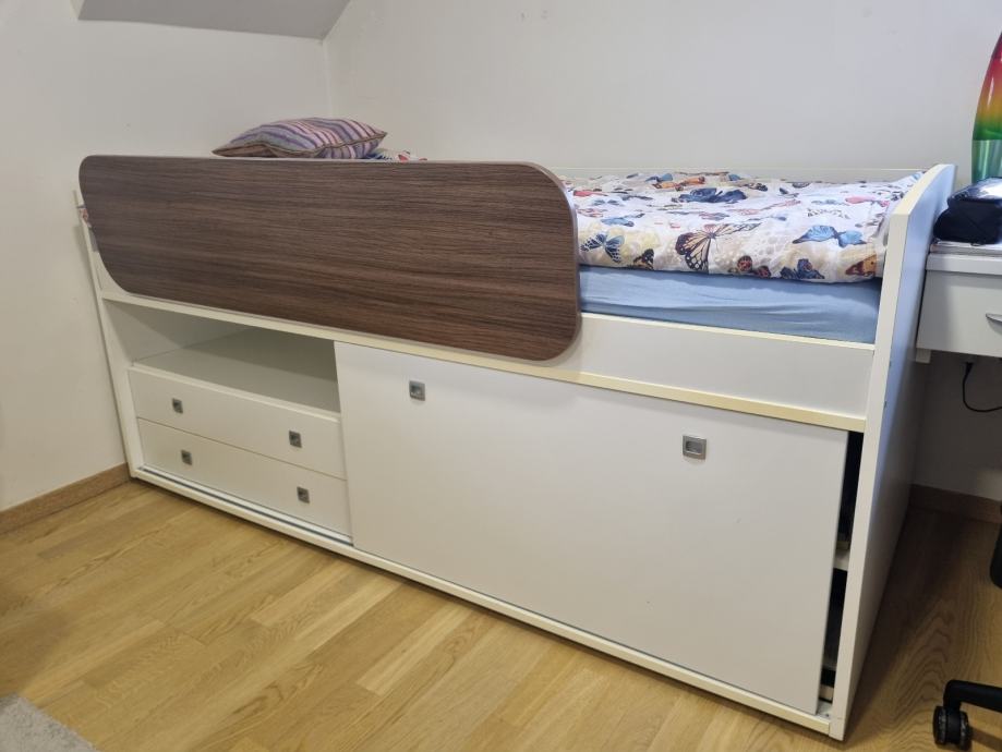 Prodajam rabljeno mladinsko posteljo znamke Alples, dimenzij 90x200 cm. Postelja ima poleg še praktične predale za shranjevanje, dodatni dve polici in je v dobrem stanju. Idealna rešitev za otroško ali mladinsko sobo, saj združuje ležišče in shranjevalni prostor. Dodatno lahko vzamete tudi jogi za 40 eur.