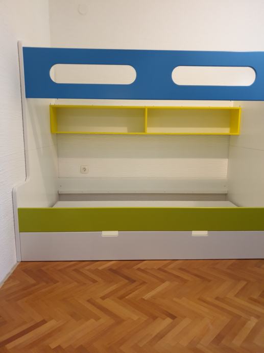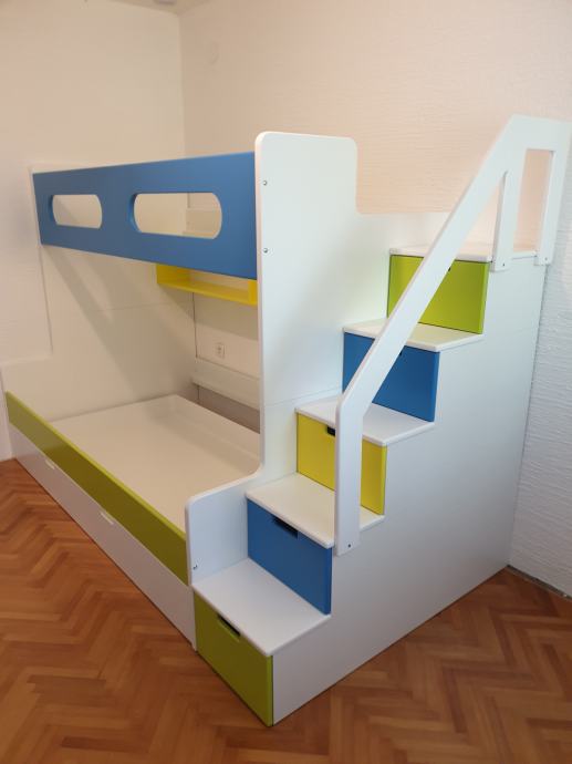 Nadstropna postelja. Stabilna, močna konstrukcija, spojena z mozniki za dolgoletno uporabo. Belo pokrivno lakirano, soft robovi.