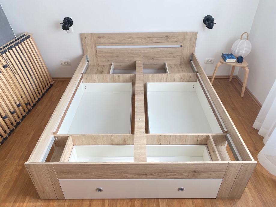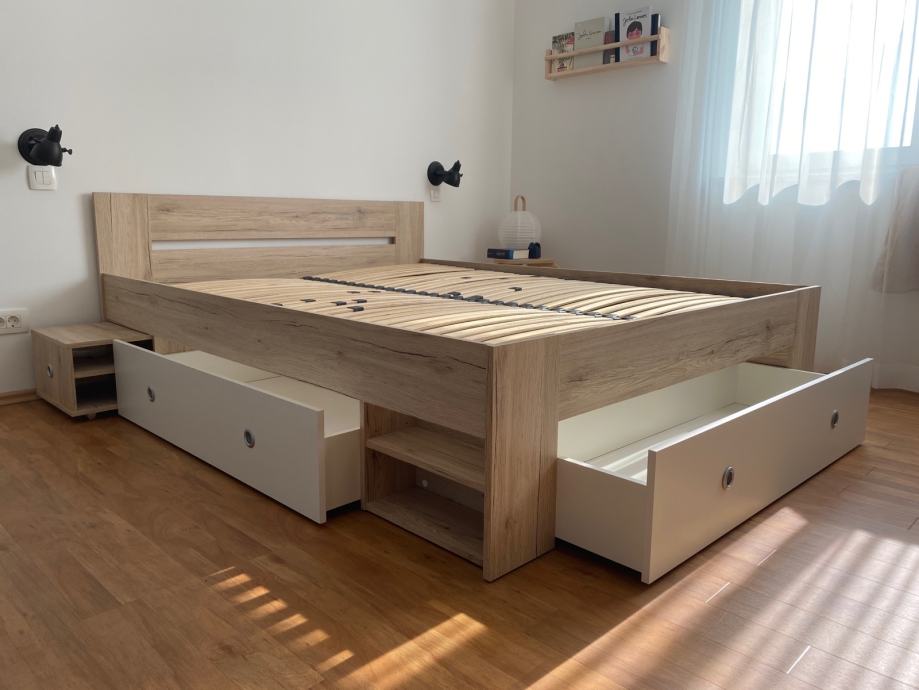 Prodam posteljo dimenzij 160 x 200. Ima ogromno prostora za shranjevanje in vgrajeni nočni omarici
