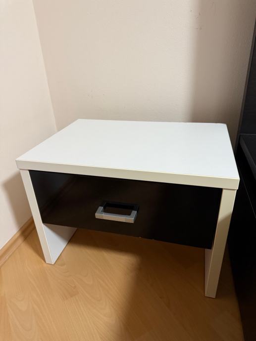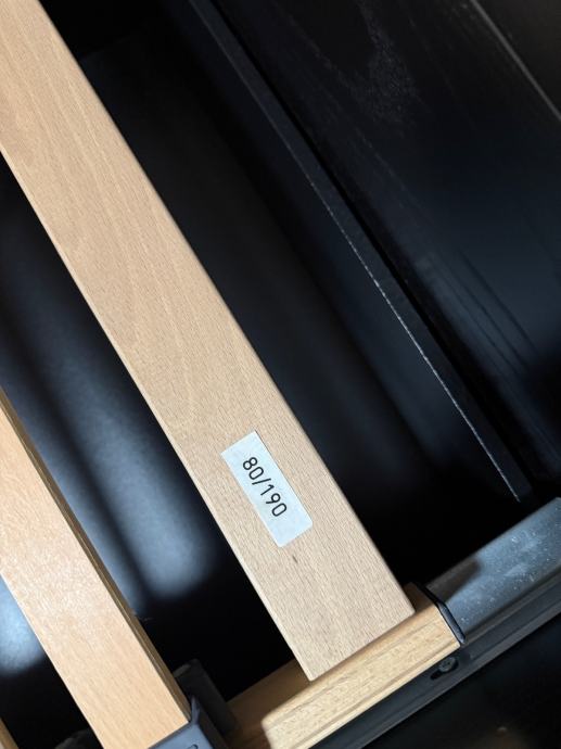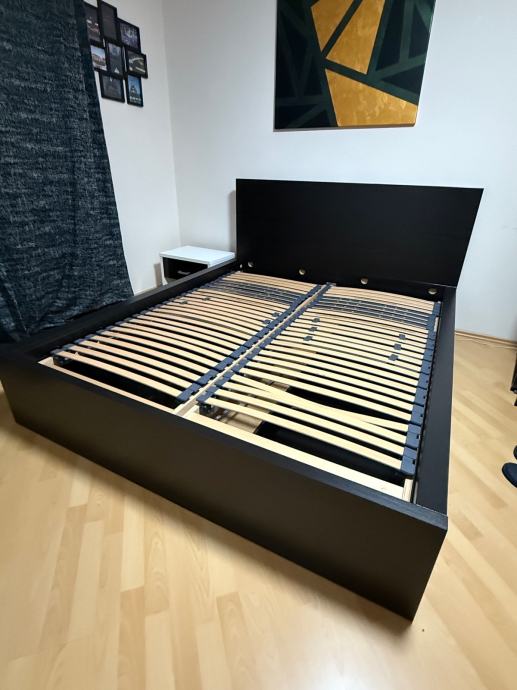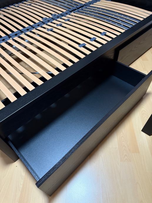 Elegantna postelja 160x200cm iz lesnega furnirja. Postelja lahko stoji sredi prostora ali z vzglavjem ob steni. Ima tudi 4 velike posteljne predale s kolesci, ki se zlahka izvlečejo. Postelja je kot nova.