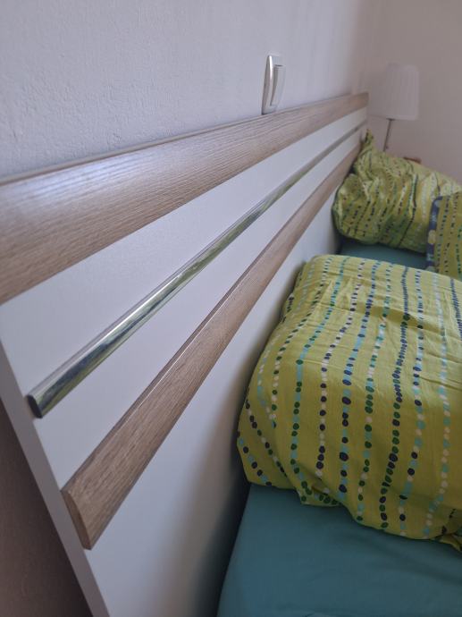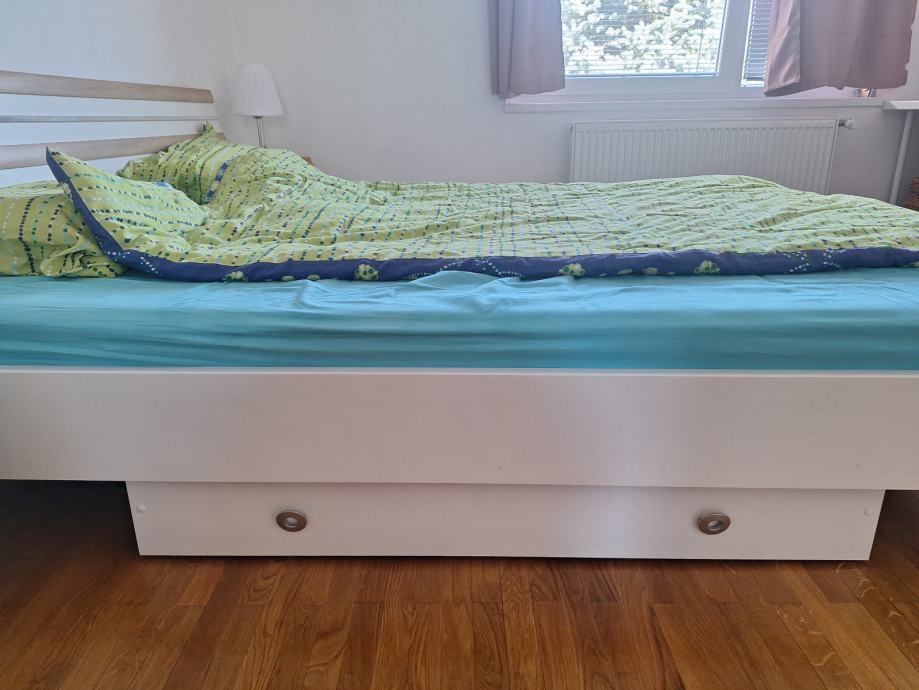 Prodam rabljeno posteljo 180x200cm bele barve s hrast motivom, predal pod posteljo in 2 nočni omarici.