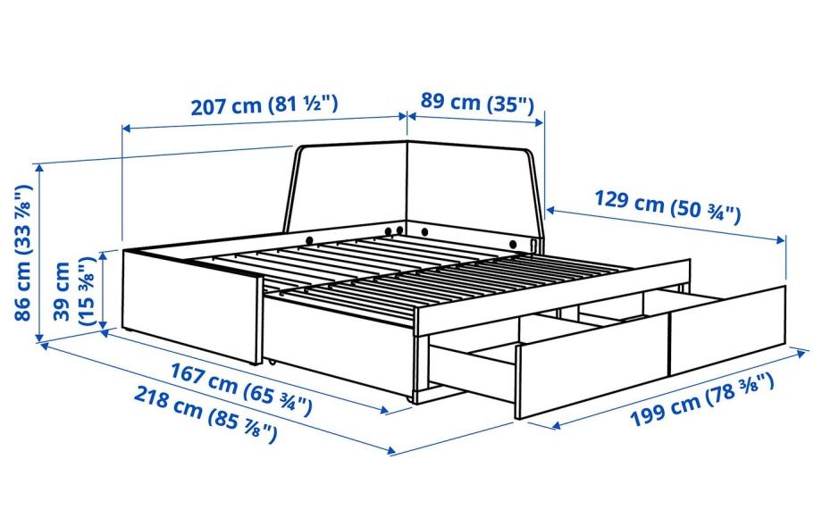 Osnovne dimenzije so 89x207cm, z izvlečenim dodatnim ležiščem pa 167x207cm. Dodatno ležišče pride nadvse prav ko kak sinov prijatelj pride prespati :) Prodajamo jo, ker smo mu naredili pograd :)