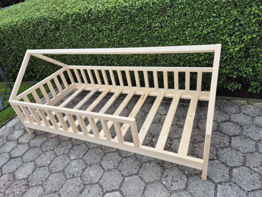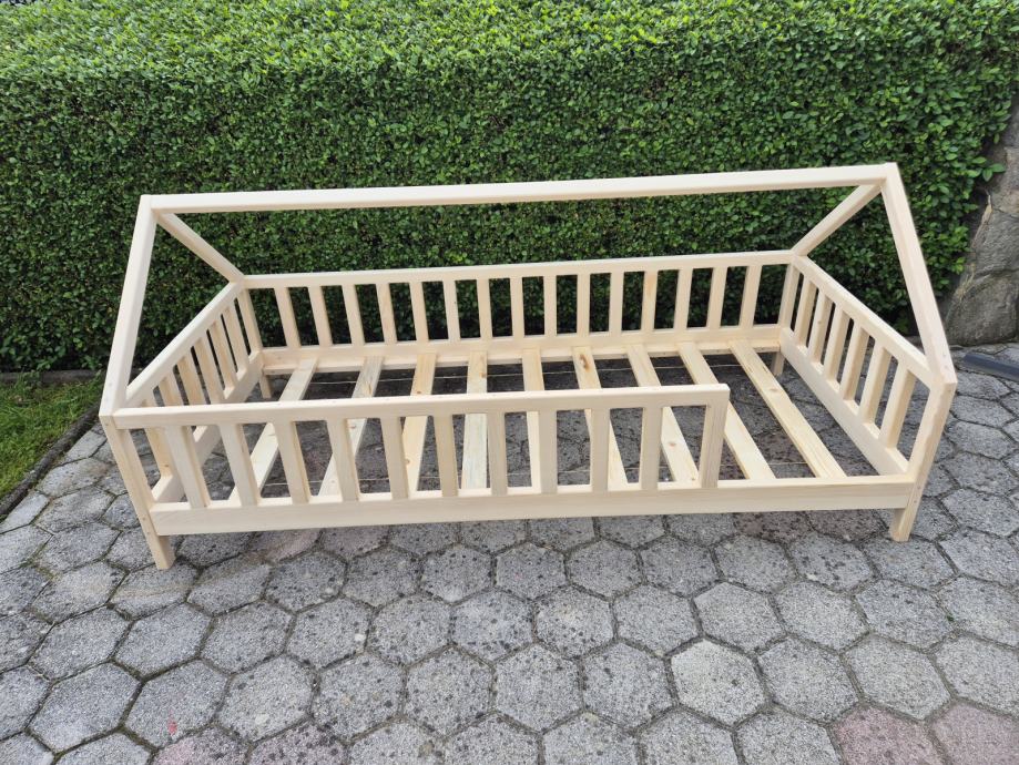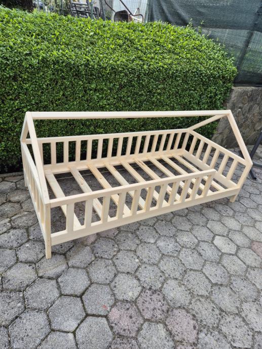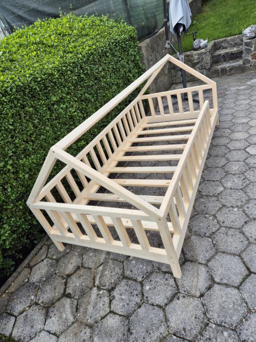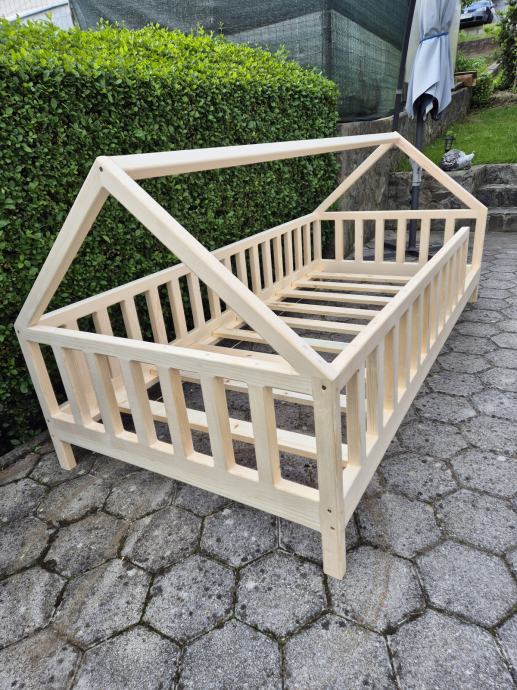 Izdelujemo otroške postelje hiške dimenzije 80 x 190/200 ali 90 x 190/200, močna konstrukcija, lepljene stranice, les smreka, brušen ne barvan, špic 95cm