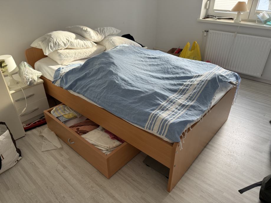 Dobro ohranjena postelja, bbrez poškodb, velikosti 200x140 cm, skupaj s predalom pod posteljo in jogijem (slednji je v bolj "bogem" stanju).