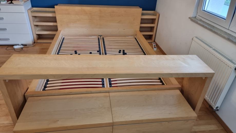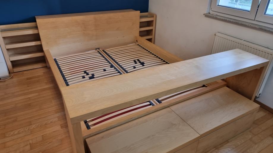 Prodam dobro ohranjeno posteljo MALM 160x200 v kompletu: posteljni okvir, letveno dno 2x, izvlečni nočni omarici 2x, obnožna posteljna polica, predalnik za shranjevanje posteljnine 2x.