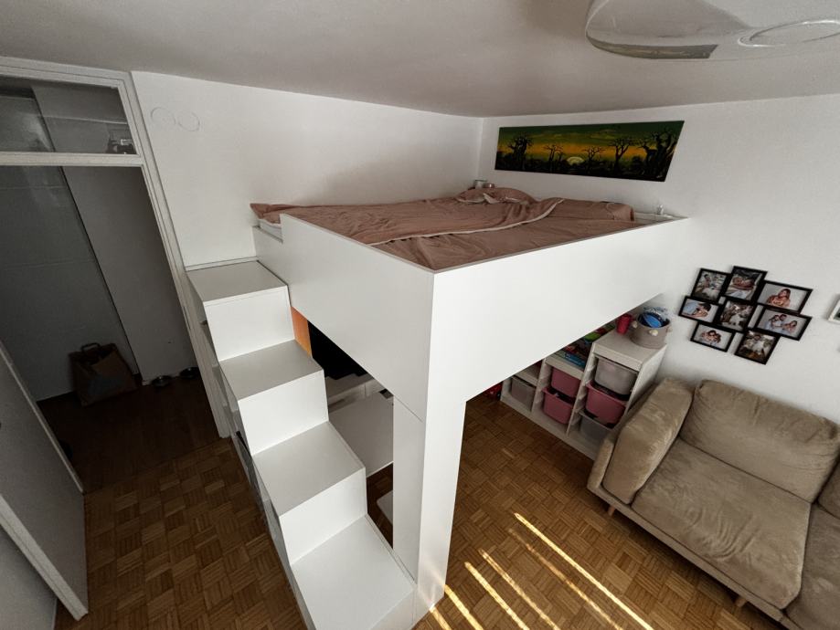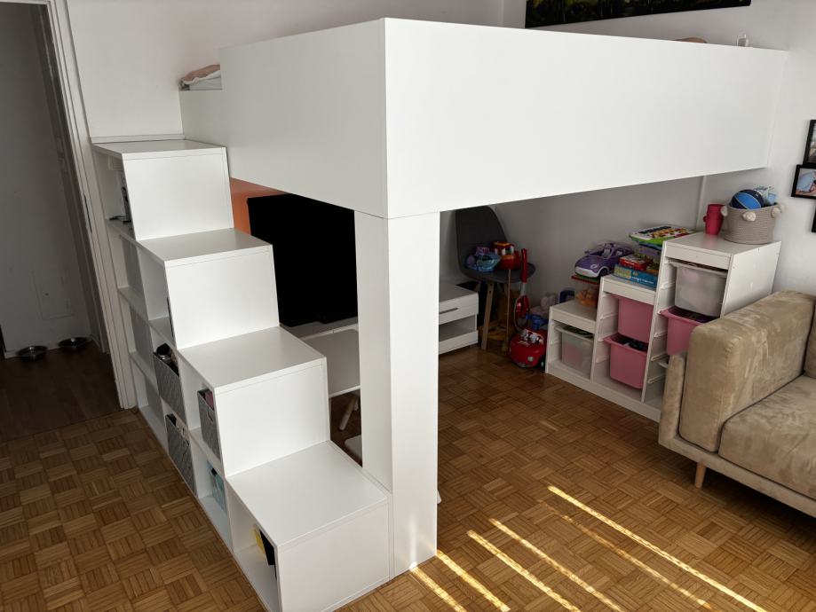 Prodam zelo trdno narejeno posteljo z zeleznim okvirjem obleceno v les. Postelja se v kompletu raztavi, stopnice pa so v enem kosu.