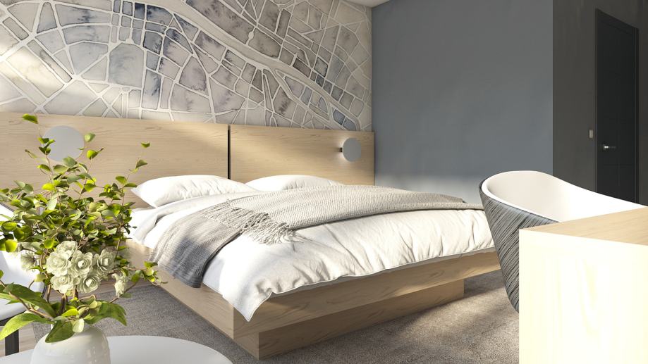Moderna, praktična, lahkotna, zakonska postelja, primerna tako za trendovske kot klasične spalnice. Spodnji del okvirja je pomaknjen proti središču, zaradi česar se na prvi pogled zdi, da postelja lebdi nad tlemi. Zaradi vizualnega učinka lebdeče postelje je primerna tudi za manjše prostore. V posteljo je možno vgraditi predale, s katerimi dobro izkoristimo tudi prostor pod vzmetnico.