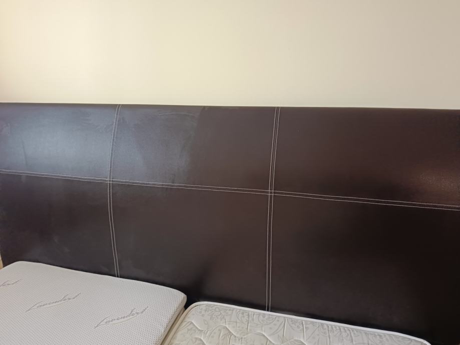 Temno rjave barve z belimi šivi. Dva ločena ortopedska jogija. Letveno dno.