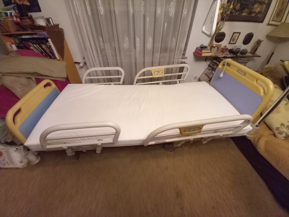 Z električnim dvigom komplet postelje, vzglavja in vznožja. Vsebuje trapez z nosilcem in vodoodporen jogi. Odlično ohranjeno