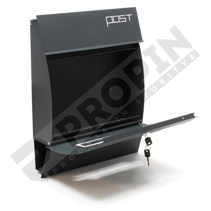 Poštni nabiralnik iz lakiranega jekla v brezčasnem klasičnem videzu. Nabiralnik ima veliko režo za pisma, sprednjo loputo za odpiranje je mogoče zakleniti, priložena sta dva ključa. Priložen je tudi montažni material. Na spodnji strani je tudi predal za časopise, tako da časopisov ni več treba shranjevati na mokrem na pragu, ampak imajo suh prostor do prinosa v hišo.
