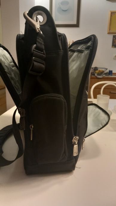 Večnamenska poslovna torba. Ima prostor za računalnik, napajalnik, mobitel, in še pet večnameskih prostorov.