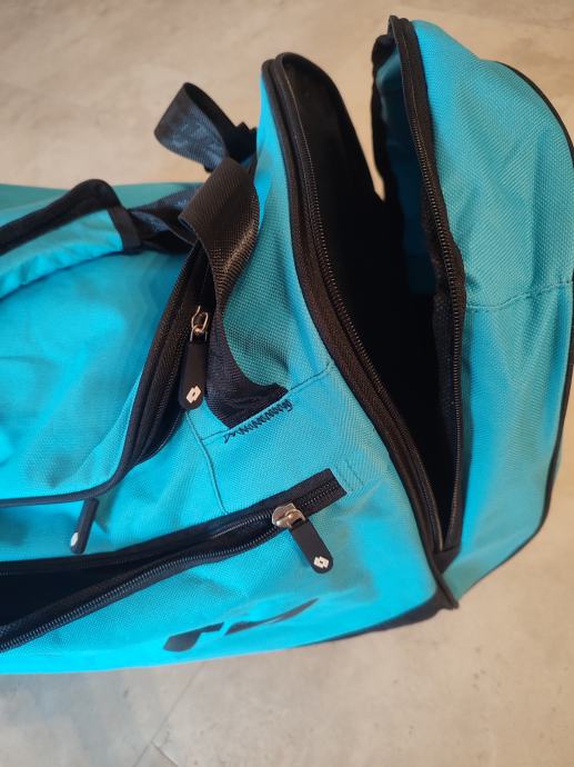 Potovalka LOTTO v svetlo modri in črni barvi. Ima tri prostore, srednji, ki je največji in dva stranska. Spredaj ima še predal na zadrgo. Ima ročaj za nošenje na rami in dva ročaja za nošenje v roki. Nepremočljiva. Velikost 60 cm x 30 cm x 35 cm (d,š,v)