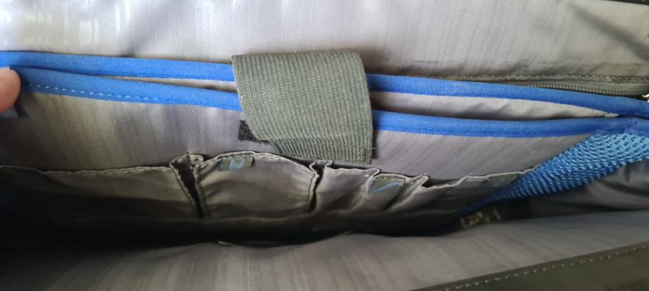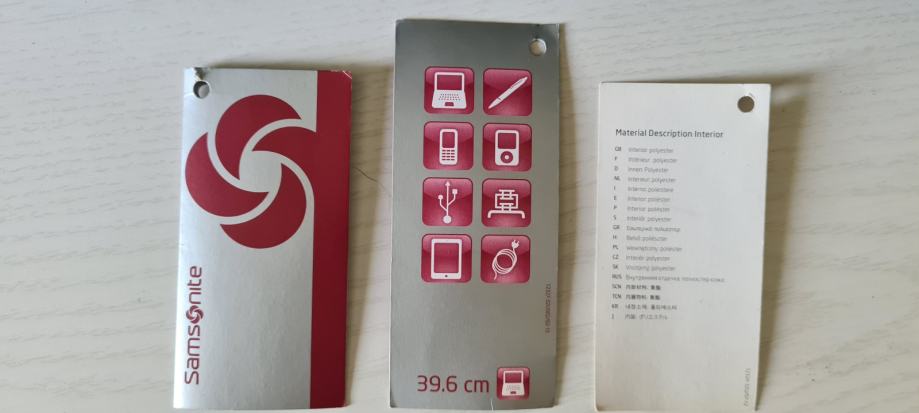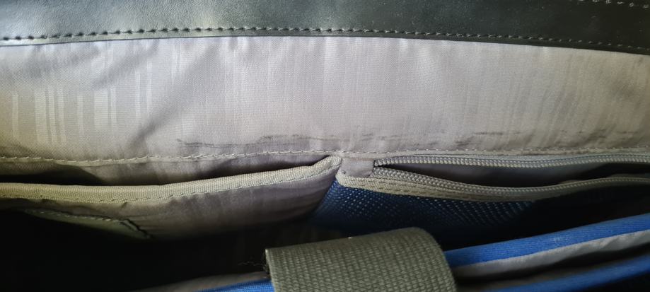 3 notranji predelni prostori z žepki. Notranji predel izoliran za prenosnik/tablico. Na zunanji strani 2 žepa z zadrgo.