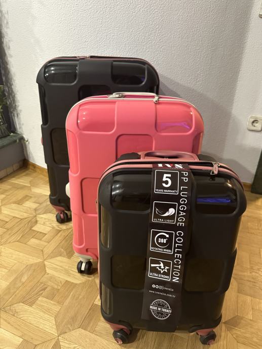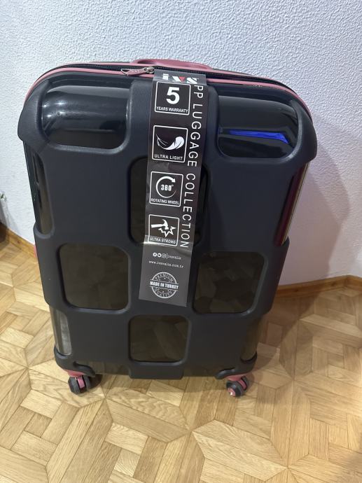 Nov silikonski kovček izredno prožen in vzdržljiv največji 30kg barva črna z roza kombinacijo.Možna prodaja tudi seta 3 kovčkov .