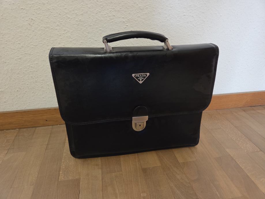 Prodam elegantno črno usnjeno torbo Prada, primerna za poslovne namene, dokumente ali prenosnik.