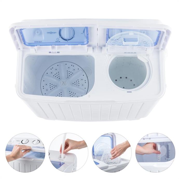 XL pralni stroj za 4,2 kg perila in 3 kg komoro za ožemanje. Primeren za posameznike, študente, vrtne hišice ali prikolice.Moč pranja 300 W in moč ožemanja 110 W.Dva različna programa za pranje občutljivih in običajnih oblačil.oneConcept Ecowash XL je pralni stroj z močjo pranja 300 W in močjo ožemanja 110W.Pralni stroj oneConcept vas bo navdušil zlasti s svojo prostornino in številnimi funkcijami. S svojo relativno veliko prostornino - za 4,2 kg perila - bo pralni stroj poskrbel za tedensko čisto perilo za posameznika ali družine na kampiranju.3 kg velika ožemalna komora skrajša čas ponovnega nošenja opranih oblačil - dodatna prednost zlasti za ljudi, ki radi kampirajo in ne želijo s seboj nositi "celotne omare".Naprava ima na voljo dva programa za pranje občutljivega in običajnega perila ter časovnik za pranje in ožemanje. Po pranju lahko odvečno vodo iz pralnega stroja odstranite z izbiro za to prilagojenega programa.Kompaktne dimenzije omogočajo uporabo pralnega stroja Ecowash XL pri kampiranju, v študentskih domovih ali kot sezonsko rešitev v vrtnih hišicah.