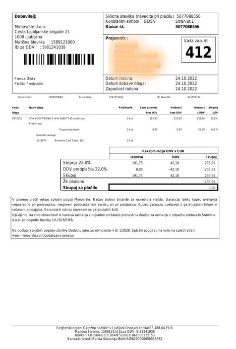 Za iznos in transport poskrbite sami. Pralnemu stroju prilagam originalni račun, specifikacijo in Navodila za uporabo. Stroj se nahaja v polpritlični kleti stanovanjskega bloka, že zapakiran ter dobro zaščiten in pripravljen na transport. Iz kleti do dvigala vodi ena vrsta stopnic, kar je potrebno upoštevati pri iznosu. Pralni stroj namreč tehta 56 kg.