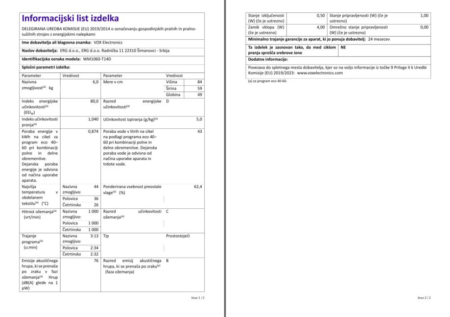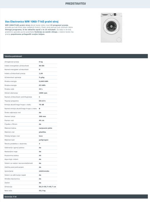 PRALNI STROJ VOX electronics WM 1060-T14D, OŽJI model, 2 leti garanci.