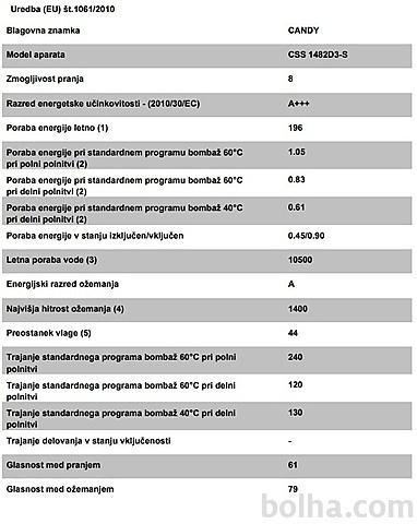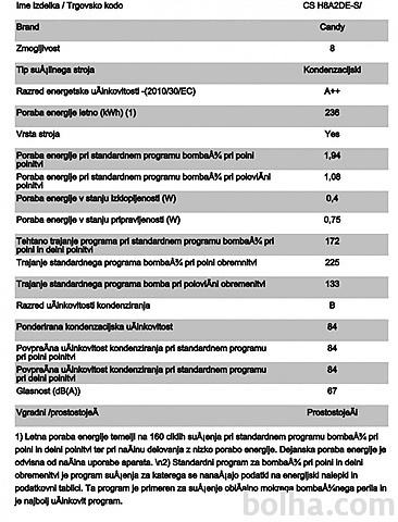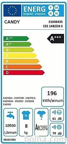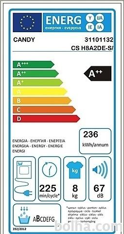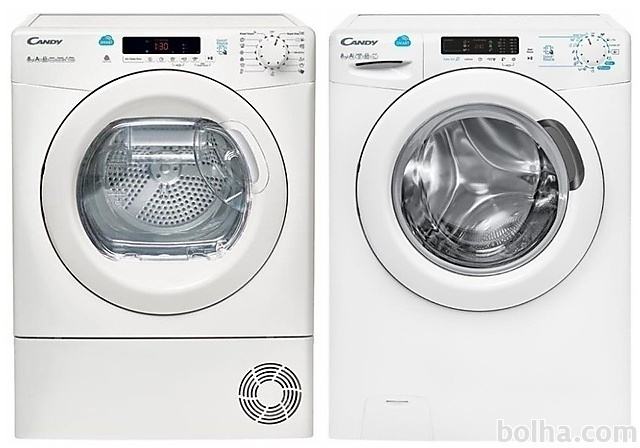 PRALNI STROJ CSS 1482D3-SCandy pralni stroj CSS 1482D3-S z zmogljivostjo pranja 8kg in 1400 obrati na minuto pri ožemanju. Pralni stroj spada v A+++ energijski razred z glasnostjo 61 dB med pranjem in 79 dB med ožemanjem. Dodana ima tudi dva nova programa s paro, ki poskrbita za učinkovito dezinfekcijo in s tem popolno higieno, obenem pa zmanjšata zmečkanost perila. Opremljen je z napredno funkcijo KG detektor, ki oceni količino perila ter prilagodi čas pranja in porabo vode ter energije. Za manjše količine pranja pa ima tudi kratki 14, 30 in 44 minutni program. Poleg klasičnega upravljanja ima stroj na voljo tudi možnost dodatnega upravljanja s pametnim telefonom preko NFC sistema.Hitri programiV današnjem neizprosnem tempu življenja, nam hitra izbira ponuja olajšanje. Candy je mislil tudi na to in tako ponuja kar tri hitr programe: Ultra hitri program v samo 14 min pri 30ºC opere 1,5 kg perila. V kolikor imate malce več časa, uporabite 30 min ali 44 min program. Pri vseh treh hitrih programih priporočamo, da odmerite le 30% običajne količine detergenta.Kg detektorPralni stroj je opremljen je z napredno funkcijo KG detektor, ki oceni količino perila, zato je strah o veliki zmogljivosti odveč. Porabil bo le toliko vode in energije kolikor perila boste dali vanj. Ima tudi možnost nastavitve stopnje umazanosti perila, kar pri manj umazanemu perilu pomeni krajše pranje, s tem pa tudi prihranek pri energiji.Smart Touch z NFC povezavoCandy vam predstavlja novi pameten pralni stroj, ki se ponaša s pametno aplikacijo SMART TOUCH z NFC povezavo. To je prvi osebni asistent, ki poskrbi za vas, vaše perilo in vaš pralni stroj. Nov način upravljanja pralnega stroja s katerim izrabite prednosti, ki jih prinaša pametna aplikacija! Preprosto naložite aplikacijo Candy simply-Fi App in pridržite svoj pametni telefon ob aparatu in že so vam na voljo številne nove možnosti na področju pranja perila, kar vam omogoča, da izberete najustreznejši način pranja za vaše potrebe.Parni programiFunkcija pare je v današnjem svetu nuja predvsem zaradi alergenih delcev in občutljivosti kože na različna pralna sredstva. Pri Candyjevih pralnih strojih se jo lahko doda med izbrane programe, na voljo pa sta tudi dva programa z že dodano funkcijo. To je program Baby, ki je namenjen pranju otroških oblačil oziroma za ljudi s posebej občutljivo kožo. Para, ki je dodana ob koncu pranja pa še posebej razkuži oblačila in odstrani ostanke pralnega sredstva. Drugi program pa je za lažje likanje, ki ob pranju mešanih oblačil poskrbi, da je ob koncu pranja na oblačilih manj gub.Lastnosti: Prostornina bobna: 58 l Povezljivost: NFC Najvišje število obratov (rpm): 1400 Material bobna: Nerjaveče jeklo Možnost zamika vklopa: Do 24 h. Barva: belaProgrami: Število programov 16 EcoMix 20° Perfect Rapid 59 Min Hitri 44 MinTehnični podatki: Zmogljivost: 8 kg Energijski razred: A+++ Letna poraba energije: 196 kWh Letna poraba vode: 10500 l Glasnost med pranjem: 61 dB Glasnost med ožemanjem: 79 dBDimenzije in teža: Višina: 850 mm Širina: 600 mm Globina: 520 mm Teža: 68 kgSUŠILNI STROJ CS H8A2DE-SCANDY kondenzacijski sušilni stroj s toplotno črpalko, model CS H8A2DE-S. Sušilni stroj energijskega razreda A++ z zmogljivostjo sušenja 8kg. Omogoča vam sušenje vseh vrst perila in oblačil. Poleg preprostosti, CS H8A2DE-S nudi tudi varčnost. S pomočjo sistema toplotne črpalke, se vam zmanjša poraba električne energije pri sušenju, obenem pa se izboljšajo rezultati sušenja.Sušenje volne in drugih delikatnih tkanin brez skrbiPosuši tudi najbolj delikatne tkanine. Certificirano s strani podjetja Woolmark.Heat Pump SystemZahvaljujoč toplotni črpalki se zrak za sušenje segreje z nizkimi stroški, obstoječa toplota pa se učinkovito in znova uporablja: V nasprotju z običajnimi kondenzacijskimi sušilnimi stroji tehnologija toplotne črpalke ne uporablja klasičnega ogrevanja: Zaprt krožni sistem zagotavlja energetsko učinkovito sušenje perila in odstranjuje vlago iz oblačil.Easy Case posoda v vratihPosoda v vratih omogoča, da z enim pogledom takoj ocenite količino vode in takoj opazite, če jo je treba odliti.Smart Touch Candy vam predstavlja novi pameten sušilni stroj, ki se ponaša s pametno aplikacijo SMART TOUCH. To je prvi osebni asistent, ki poskrbi za vas, vaše perilo in vaš stroj. Nov način upravljanja stroja s katerim izrabite prednosti, ki jih prinaša pametna aplikacija! Preprosto naložite aplikacijo Candy simply-Fi App in pridržite svoj pametni telefon ob aparatu in že so vam na voljo številne nove možnosti na področju sušenja perila, kar vam omogoča, da izberete najustreznejši način sušenja za vaše potrebe.Lastnosti: Zmogljivost sušenja: 8 KG Energijski razred: A ++ Elektronsko upravljanje Prikazovalni ekran Letna poraba energije: 236 KWH Časovni zamik: do 24 ur Indikator filtra Indikator vode Indikator končnega cikla Senzor vlage Protialergijsko sušenje Funkcija za lažje likanje Boben: Pocinkano jeklo Bela barva Glasnost delovanja (dB): 67Programi sušenja: Program za rjuhe Program za volno Program za otroško nego Program za Jeans Program proti krčenju Program proti natlačenosti Program za sintetična oblačila Pametni program ECO program Program za belo perilo Program za temno in barvito perilo Program za osveževanje Program za srajce Program za športna oblačila Program za hitro sušenje mešanih oblačilDimenzije: Mere (V x Š x G): 85 X 59,6 X 58,5 cm Teža: 41 kg Več podatkov si oglejte na tej povezavi...