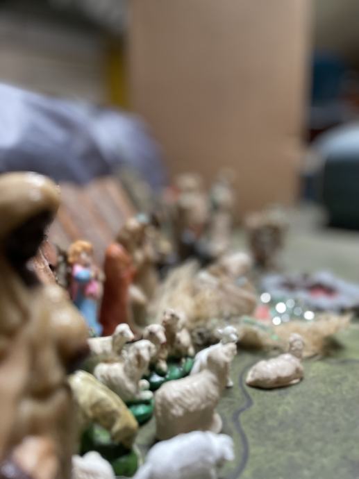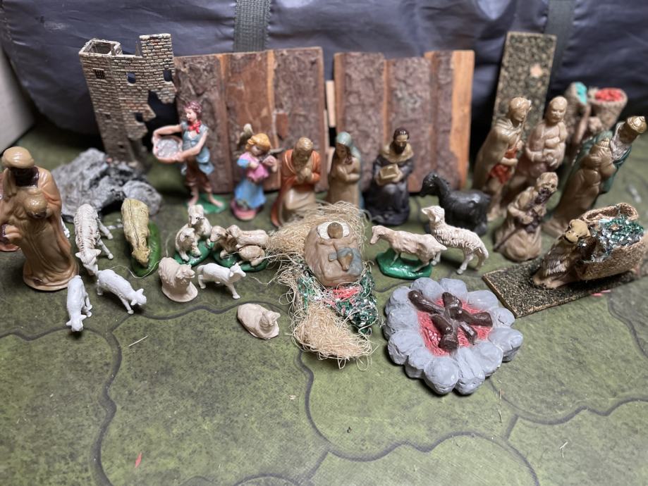 Prodam ohranjene jaslice. Figure so razvidne iz priloženih slik. Material podoben umetnemu kamnu. Figure so masivne in razmeroma težke. Živali iz trde plastike. Velikosti figur: Jožef 8 cm, Marija 8 cm, angel 7 cm, pastir 10 cm