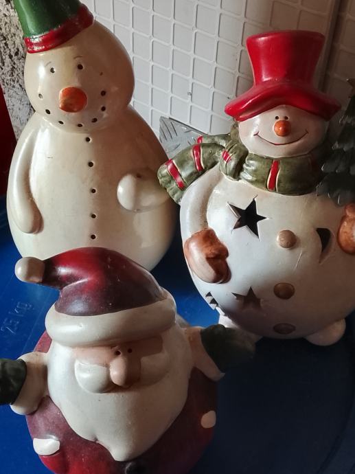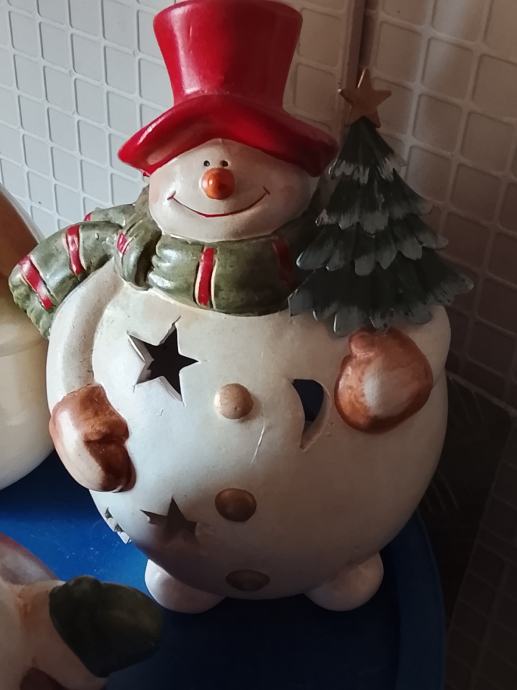 Lepo ohranjeni keramični božiček in 2x sneženi mož. Sneženi mož s smrekico je svečnik za čajno svečko.