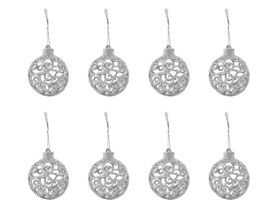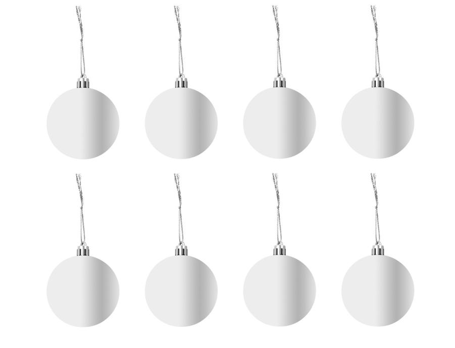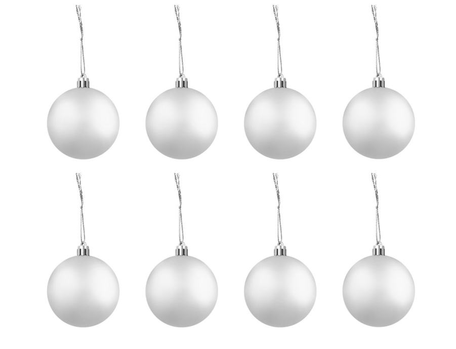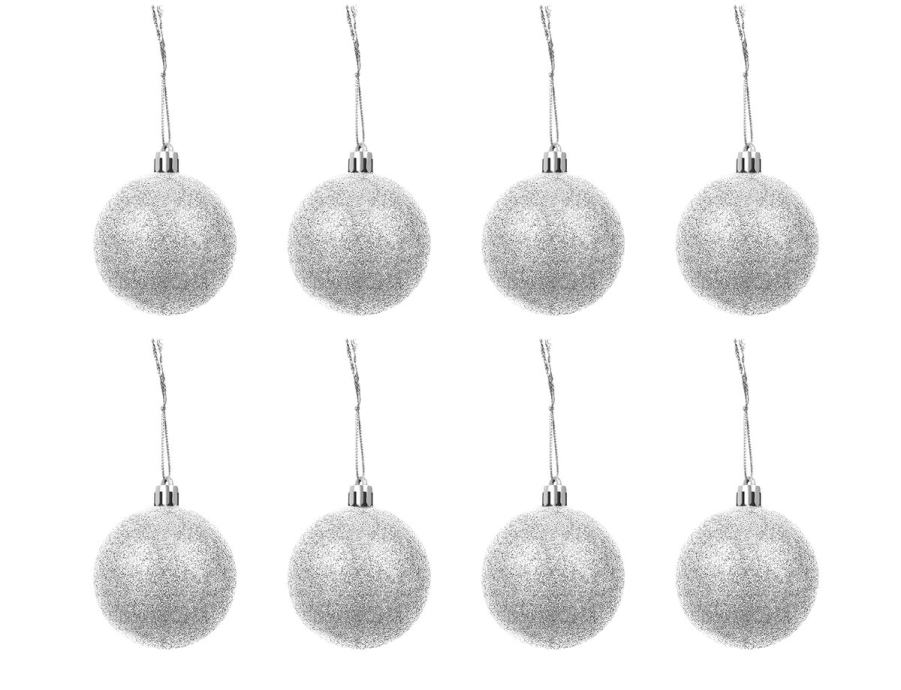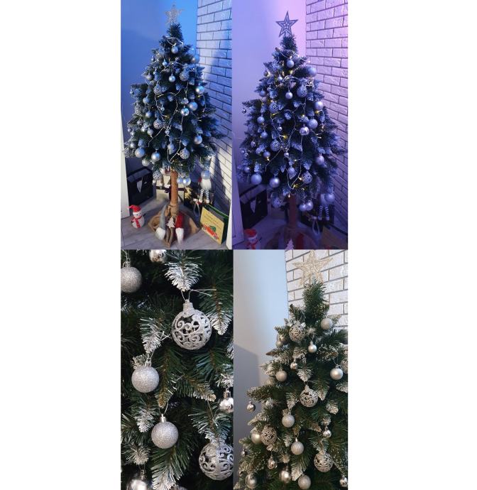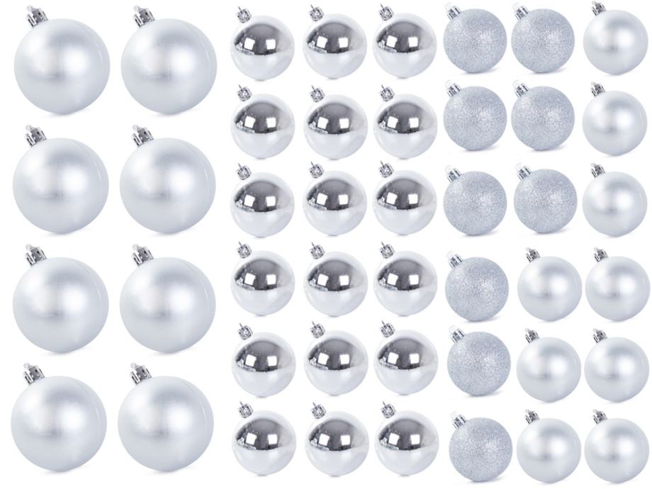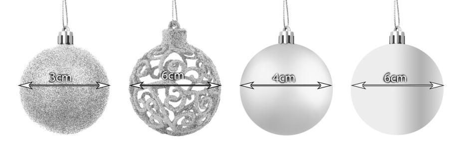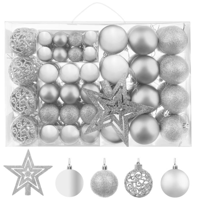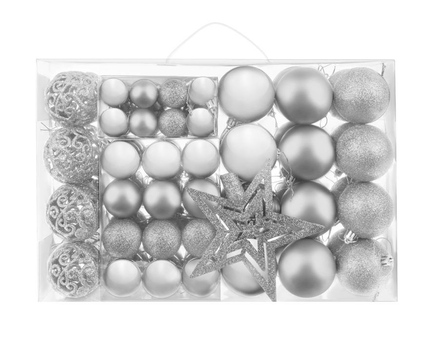 SPECIFIKACIJA – barva: srebrna; material: plastika; število kosov v kompletu: 100 + zvezdica; vrste kroglic: mat, bleščeče, sijoče, odprte; premeri kroglic: 6/4/3 cm; mere zvezdice (dolžina / širina): 12/14 cm; teža: 0,7 kg; teža v paketu: 0,9 kg.