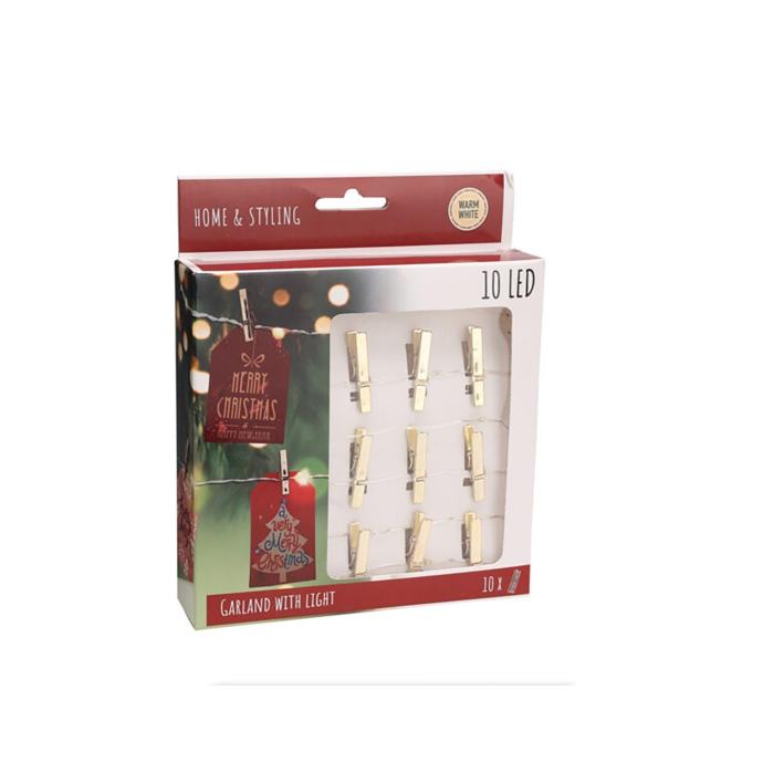 Ta dekorativna LED svetlobna veriga je opremljena z 10 elektroprevlečenimi ščipalkami in s svojimi 20 toplo belimi LED-lučkami ustvarja prijetno atmosfero. Veriga je idealna za obešanje fotografij, voščilnic ali majhnih dekorativnih predmetov.S 30 cm dolgim napajalnim kablom in 10 cm razdalje med lučkami je fleksibilna za uporabo. Škatlica za baterije deluje z 2 x AA baterijama (nista priloženi). Lučke so na voljo v dveh elegantnih barvnih variantah: zlati in srebrni, zato so popolne za božični čas, rojstne dneve ali kot stilska dekoracija v bivalnih prostorih.Prosimo, upoštevajte, da je izbira barve naključna.