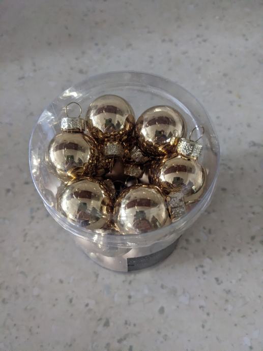 Prodajam nov komplet 24 prazničnih obeskov v zlati barvi, ki so še neuporabljeni in v originalni embalaži. Elegantni in bleščeči okraski so idealni za okrasitev božičnega drevesca ali druge praznične dekoracije.