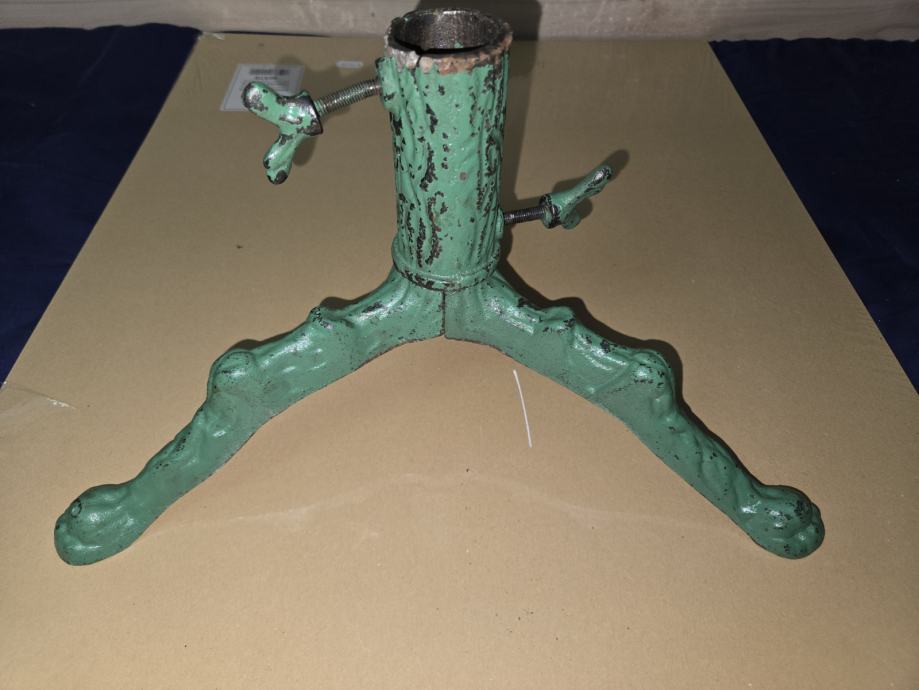 Prodam zelo star podstavek za božično drevo, lito železni. Podstavek je sestavljen iz treh nog in stebrom. Lahko se raztavi in spravi na shranjeno mesto, ki ne zahteva veliko kapaciteto, saj zložen podstavek ne zavzame veliko prostora. Ima dva pritrditvena vijaka. Eden služi za pritrditev nog, drugi pa za pritrditev debla božičnega drevesa. Podstavek je lepo izdelan iz lite kovine in še z originalno barvo ter ima na stebru udrtine, ki ponazarjajo steblo, oz. lublje drevesa. Ta podstavek je eden prvih tovrstnih postavkov, za namen božiča. Mislim, da je narejen nekje v času prve vojne, morda pa že prej.