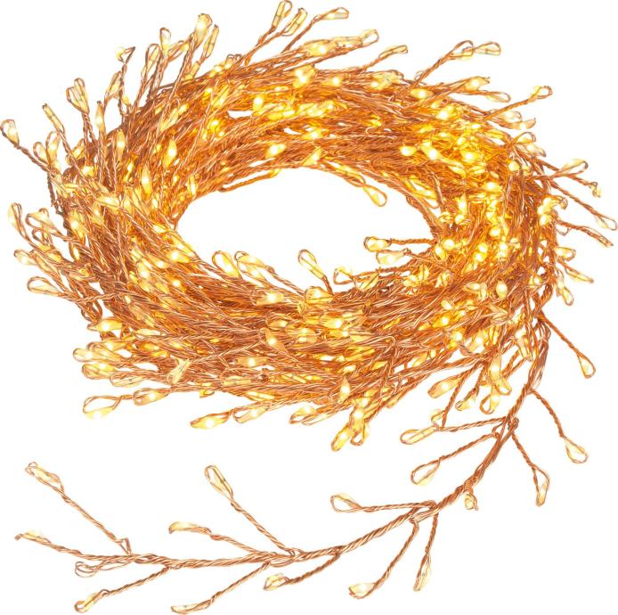 Svetlobna žična LED-veriga ustvarja svetlobne poudarke v zimskem in božičnem času. Z upogljivo bakreno žico vam ponuja individualne možnosti oblikovanja. Tako lahko svetlobno verigo ovijete okoli rastlin in dreves, jo namestite na stopnicah ali vstavite v vaze. Primerna je za notranje in zunanje prostore. Svetlobna žična LED-veriga s 480 LED-diodami ima 5 m dolg napajalni kabel, s katerim lahko uresničite številne oblikovalske ideje. S svojim prozornim kablom ostane diskretna in nevpadljiva. Svetlobna žična veriga je dolga 9,8 m.Zimska in božična dekoracija s trpežnimi LED-diodamiTrpežne LED-diode prepričajo z nizko porabo energije in nizkim razvojem toplote. Poleg tega boste imeli koristi od bogatega svetlobnega izkoristka. Svetlobna žična LED-veriga oddaja v vašem bivalnem prostoru in na prostem prijetno toplo belo svetlobo.