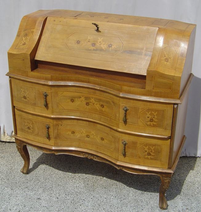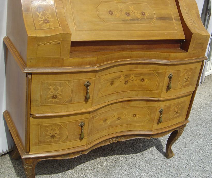 BAROČNI STIL IZDELAN IZ MASIVNEGA LESA IN FURNIRAN Z DEBELIM OREHOVIM FURNIRJEM, LEPE INTARZIJE ROŽIC JAVOR. ZELO LEPO OBLIKOVAN-TREBUŠAST, SPODAJ DVA PREDALA. ZGORAJ SE ODPRE IN SLUŽI, KOT DAMSKA PISALNA MIZA. **NI restavriran!** Na željo se ga restavrira.