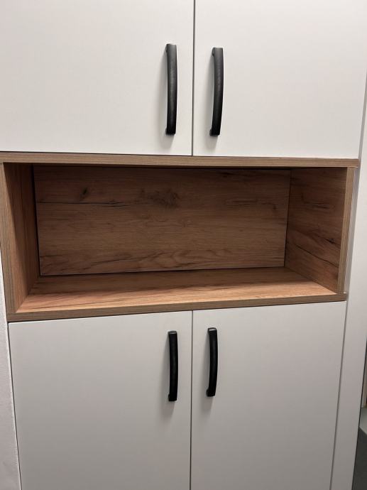 Prostorna bela garderobna omara dimenzij 155x260, v rabljenem stanju, z ogledalom in lesenimi detajli. Odlična izbira za predsobe, z veliko prostora za shranjevanje in praktično organizacijo.