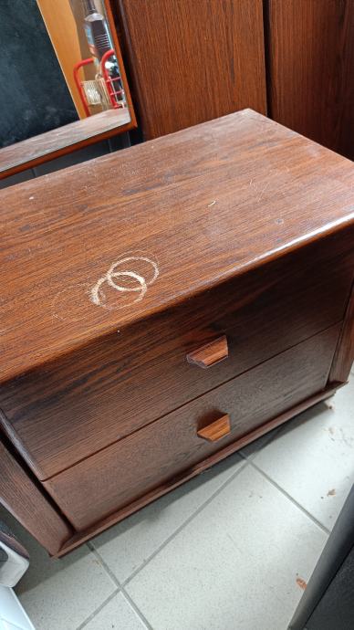 Komplet za predsobo z ogledalom, obesalniki za jakne in manjsim predalnikom. Na predalniku je nekaj kozmeticnih poskodb.