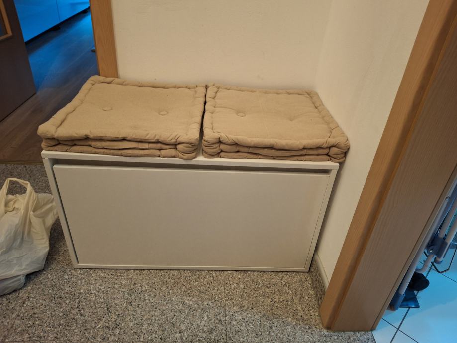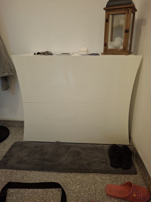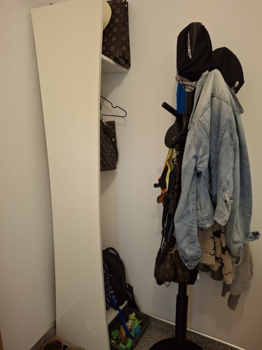Sestavljena iz klopce z blazinami, samostoječega ogledala, omarice za čevlje ter zaprtega obešalnika v beli barvi visok sijaj. Zelo lepo ohranjeno