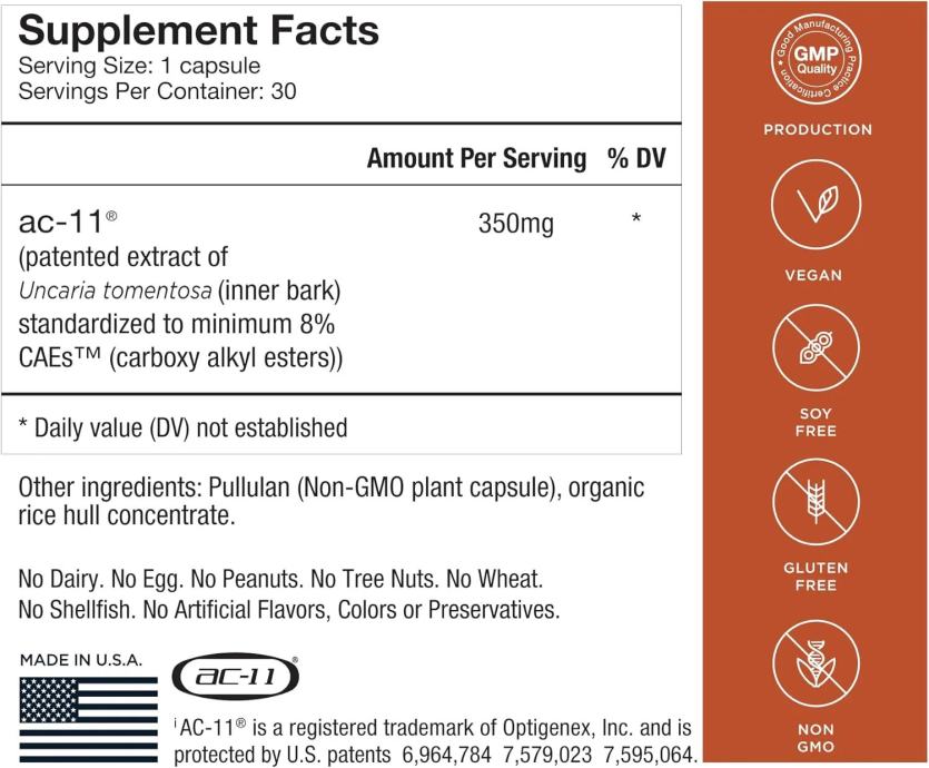 AC-11 ® je varen, naraven, vodotopen in patentiran rastlinski izvleček pridobljen iz Mačjega kremplja (Uncarie tomentose) — divje, pristne, avtohtone rastline iz območja Amazonskega deževnega gozda.