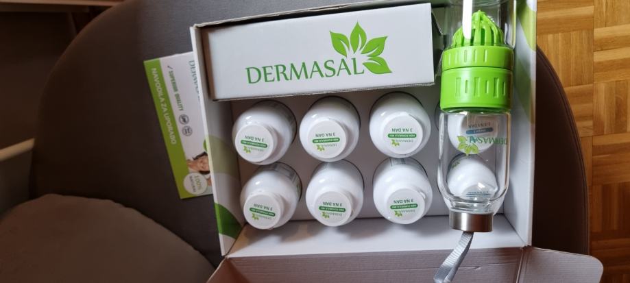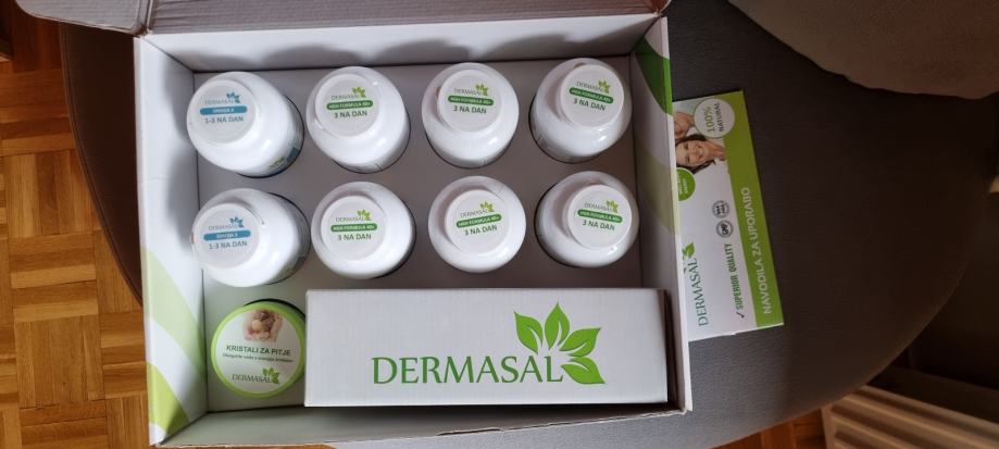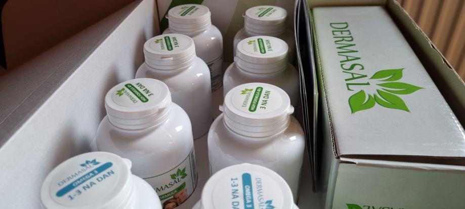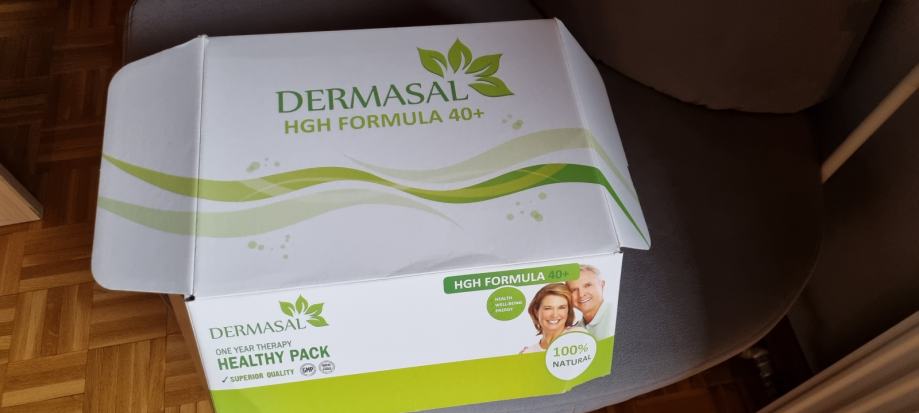 Prodam Dermasal Healthy pack (superior quality), ki vsebuje prehranska dopolnila, ki zadostujejo za obdobje enega leta. Paket vsebuje originalno zaprtih 6 embalaž s hgh formulo 40+ kapsulami, 2 embalaži omega 3 kapsul, kristale za pitje, Dermasal stekleničko in navodila za uporabo.