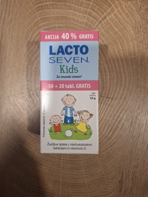 Lacto Seven Kids vsebuje edinstveno kombinacijo sedmih mlečnokislinskih bakterij. Bakterije so v tabletah zaščitene s posebno zaščito, ki jim omogoča preživetje v kislem okolju želodca ter prehod v črevo, kjer delujejo. Mlečnokislinske bakterije so živi organizmi, zato je pomembno, da prispejo do črevesja žive. Tabletam je dodan vitamin D3, ki prispeva k delovanju imunskega sistema. Potreben je tudi za ohranitev zdravih kosti in zob ter za delovanje mišic.
