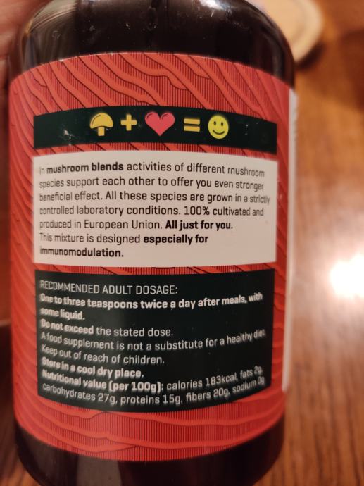 Mešanica gob sestavljena iz štirih vrst gob Ganoderma lucidum, Lentinula edodes, Trametes versicolor in Agaricus blazei, katero priporočamo kot podporni tretma pri agresivnih konvencinalnih tretmajih in posegih. Nabavna cena, Sanolabor: 46 €. Prašek je samo odprt. Cena 30 €.