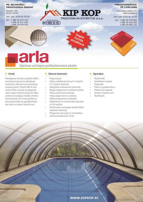 POLIKARBONATNE PLOŠČE znamke ARLA PLAST odlikuje enostavna montaža, izredna lahkotnost ter večnamenska uporaba. Vse plošče priznane blagovne znamke imajo UV-zaščito.
