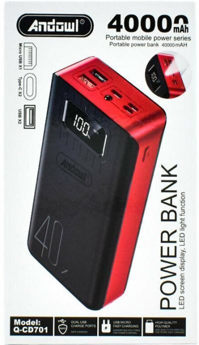 Zunanja baterija Andowl Q-CD701 s kapaciteto 40000 mAh vam bo zlahka pomagala napolniti vašo napravo, ko ste stran od električnega omrežja, kjer koli že ste. Pozabili boste na prihajajočo izpraznitev pametnega telefona, tablice ali katerega koli drugega pripomočka. Ostanite povezani kjerkoli in kadarkoli. Zunanja baterija Andowl je nepogrešljiv pomočnik aktivnih in poslovnih ljudi. Odlična zmogljivost baterije, preprost, priročen in eleganten dizajn zagotavljajo hitro polnjenje in priročno uporabo naprave tako v vsakdanjem življenju kot na potovanju.Tudi na ohišju je indikator napolnjenosti zunanje baterije in zmogljiva dvojna LED svetilka, ki vam pomaga ti v vsaki situaciji.