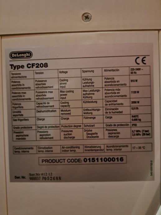 Ugodno prodam malo rabljeno mobilno klimo DeLonghi CF208 na kolesih, kompletna z odzračevalno cevjo in nastavkom za okno.