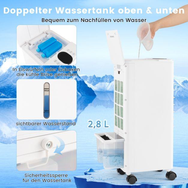 2 možnosti upravljanja in dvojni rezervoar za vodo: Prenosni hladilnik zraka je opremljen z LED ploščo na dotik in daljinskim upravljalnikom, tako da lahko preprosto prilagodite vse nastavitve. Poleg tega je oblika z dvema rezervoarjema za vodo na vrhu in na dnu primerna za dolivanje vode. Indikator nivoja vode vas opomni, da vodo pravočasno napolnite.