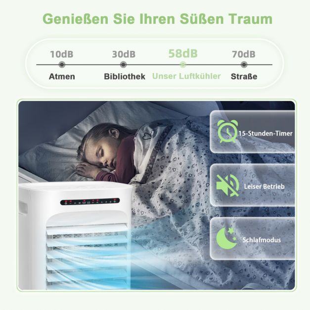 3-stopenjski ventilator in 8-urni časovnik: Zahvaljujoč praktični funkciji časovnika klimatska naprava zagotavlja, da lahko ponoči uživate v udobnem spanju pri ustrezni temperaturi. Poleg tega je ventilator nastavljiv na 3 hitrosti. Ta funkcija vam v kombinaciji s hladilnikom in grelnikom zraka omogoča individualno prilagajanje hlajenja in ogrevanja ter zagotavlja optimalno hitrost.