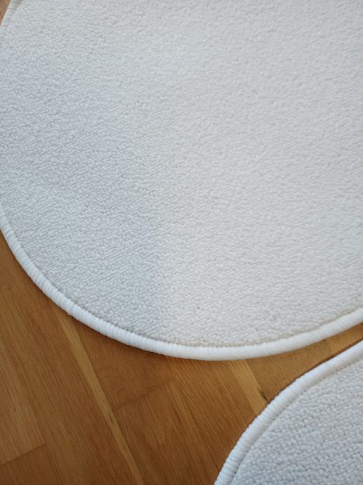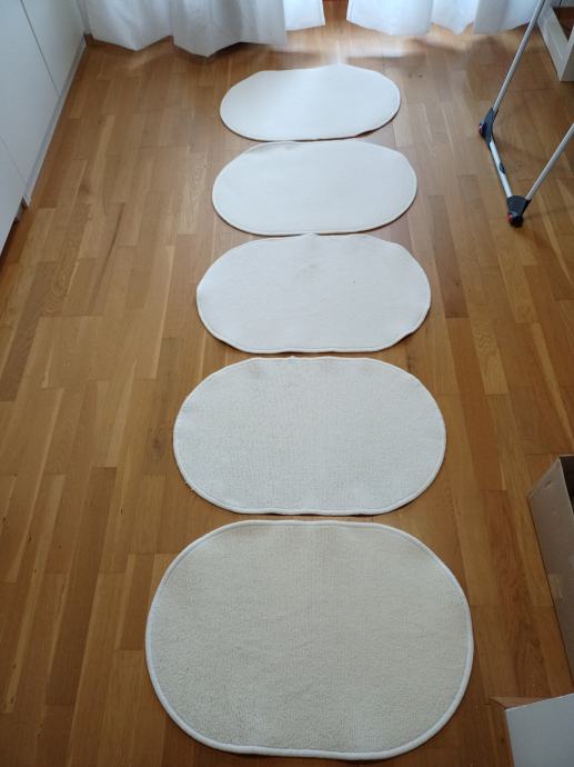 Prodam 5 brezhibnih kopalniških preprog bele barve, dimenzije 44 cm x 67 cm. Dve sta popolnoma novi ostale tri pa so bile v uporabi (so oprane). Cena novih je 1,5 evra, cena rabljenih 1 evrov/kos. Če vzamete vseh 5 je cena samo 5 evrov. Prevzem možen na Vrhniki ali občasno v Ljubljani za Bežigradom. Več info na tel 041 684 078. Vabljeni tudi k ogledu drugih mojih oglasov, prodajam veliko kvalitetnih stvari po zelo ugodnih cenah. Če vzamete več stvari iz mojih oglasov (iz vsaj treh oglasov) vam dam še dodaten popust ali vam krijem s roške navadne poštnine.