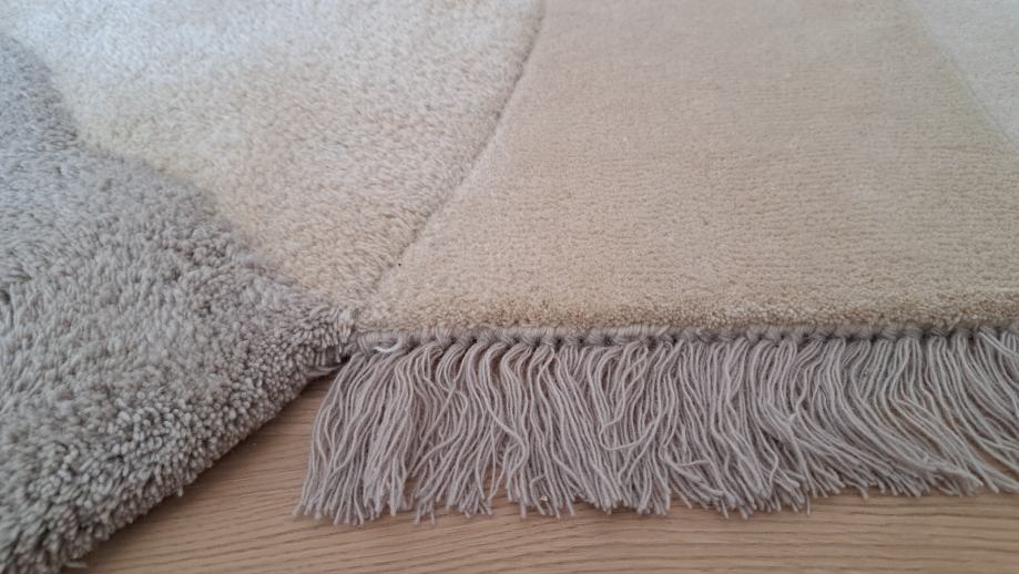 With its varying pile heights, the design creates depth and dimension, making it a striking yet subtle focal point in living rooms, bedrooms, or contemporary spaces. The neutral beige palette enhances its versatility, allowing it to seamlessly complement a range of interior styles. Finished with fringed trim, this New Zealand wool rug brings texture and warmth to modern living.