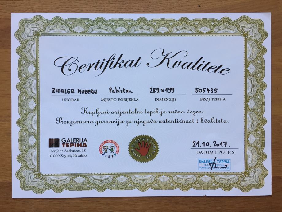 Točne mere so vidne na vernih fotografijah in znašajo 289 x 189 centimetrov. Država izvora je Pakistan, originalna številka je 505435, medtem ko je vzorec opisan kot Ziegler Modern.